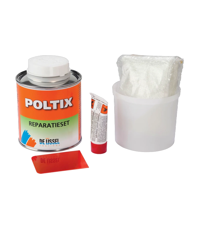 De IJssel Poltix Reparatieset is een complete, gebruiksvriendelijke set voor het herstellen van kleine tot middelgrote beschadigingen aan polyester ondergronden. Denk hierbij aan scheuren, blaasvorming, gaatjes of delaminatie in boten, surfplanken, caravans, auto-onderdelen of vijvers. De set bevat alles wat nodig is om snel en effectief aan de slag te gaan: voorversnelde onverzadigde polyesterhars, een tube MEKP-verharder, glasmat (voor versteviging), een mengbeker en een spatel voor eenvoudige verwerking.